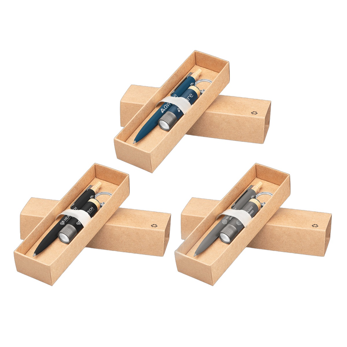 Discover purposeful gifting with the Reborn Aluminum Bamboo Accented Pen & Flashlight Gift Set. This refined pairing blends modern design with everyday function, offering a thoughtful duo for any occasion. The set features the Reborn MTR Pen, crafted from recycled aluminum and laser engraved for a premium, lasting logo display. It's perfectly matched with the compact Reborn FIC Flashlight, also made from recycled aluminum and accented with natural bamboo. Both items feature a sleek metallic finish and are beautifully nestled in a kraft paper gift box, enhancing the unboxing experience. The pen is available with black Dokumental® ink, and the flashlight provides reliable illumination for daily carry or unexpected moments. Ideal for conferences, client gifting, or showing employee appreciation. 2.05" H x 7.01" W x 1.41" D