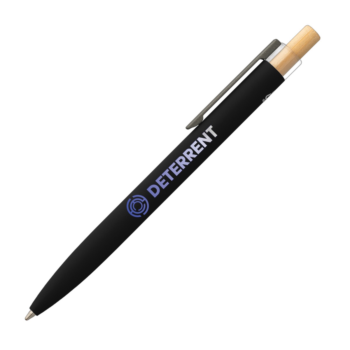 A perfect blend of style and performance, the Reborn Recycled Aluminum Deluxe Pen features a sleek recycled aluminum barrel with a rubber-painted finish. The clear RPET plastic top and bamboo plunger add distinct, quality touches. Featuring a Parker-style refill, it ensures a smooth writing experience for up to 2000 meters. A standout feature of this pen is its laser engraving with a mirror finish, providing a sophisticated touch. Opposite the gunmetal-painted steel clip, a subtle engraved recycled symbol highlights the pen's sustainable origin. 5.51" W x 0.39" D