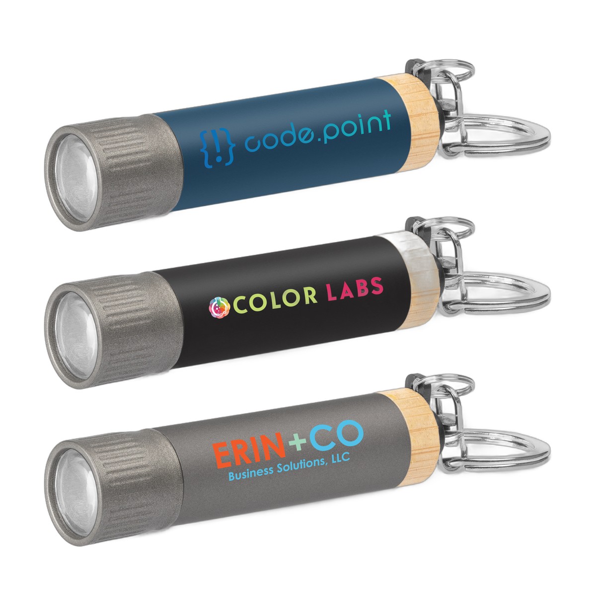 Introducing the Reborn Recycled Aluminum Keychain Flashlight, crafted from recycled aluminum with bamboo end sourced via responsible forestry, for a sleek design. The barrel is matte-painted recycled aluminum, while the RABS end is finished in gunmetal paint, and the bamboo end has a rubber on/off push button. It features a steel keyring with a swivel for easy attachment and provides powerful illumination with 3 super bright SMD lights producing 12-14 lumens. The flashlight has a continuous battery life of 2 hours and is powered by 4 mercury-free LR44 button cell batteries. A battery warning tag is attached to the large ring, and the rubber on/off button includes a yellow battery tab to prevent accidental activation. Complies with Prop 65. 0.67" H x 2.80" W x 0.67" D