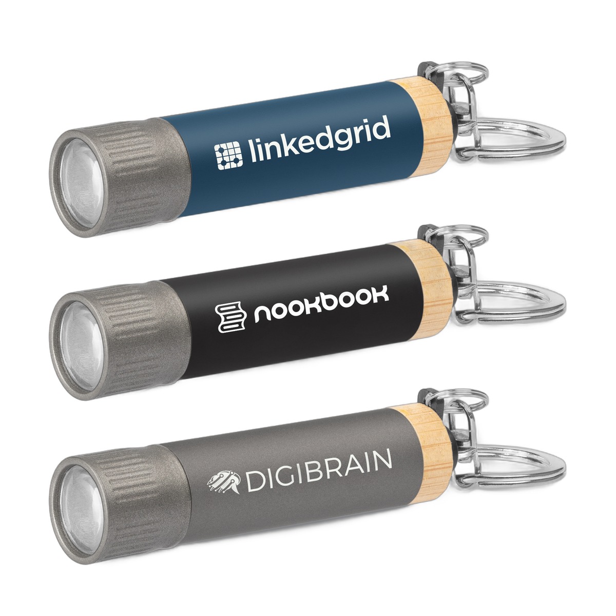 Introducing the Reborn Recycled Aluminum Keychain Flashlight, crafted from recycled aluminum with bamboo end sourced via responsible forestry, for a sleek design. The barrel is matte-painted recycled aluminum, while the RABS end is finished in gunmetal paint, and the bamboo end has a rubber on/off push button. It features a steel keyring with a swivel for easy attachment and provides powerful illumination with 3 super bright SMD lights producing 12-14 lumens. The flashlight has a continuous battery life of 2 hours and is powered by 4 mercury-free LR44 button cell batteries. A battery warning tag is attached to the large ring, and the rubber on/off button includes a yellow battery tab to prevent accidental activation. Complies with Prop 65. 0.67" H x 2.80" W x 0.67" D