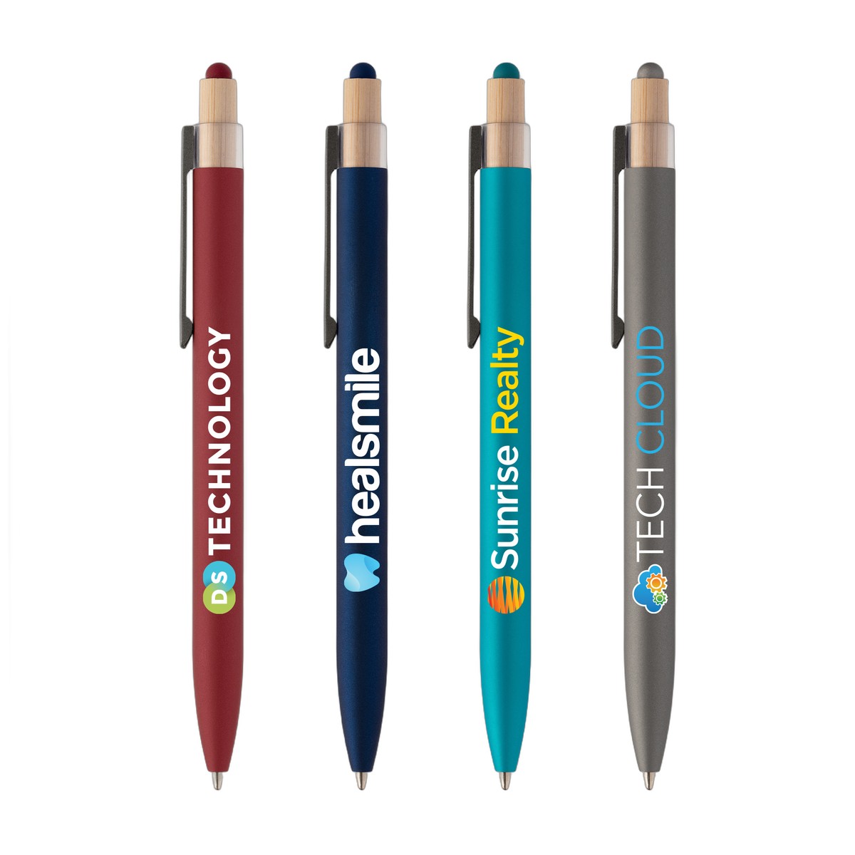 The Reborn Recycled Aluminum Stylus Pen features a 100% recycled aluminum barrel with a satin rubber-painted finish for a sleek, modern look. The barrel is accented with clear PET plastic at the top and a bamboo plunger with a color-matching stylus for added functionality. The steel clip is finished in gunmetal for a stylish contrast, and a recycled aluminum symbol is laser engraved on the opposite side of the clip. With a slim plastic refill and Dokumental ink, it offers a smooth, consistent 900m write-out with a 1.0mm tip. 5.63" W x 0.39" D