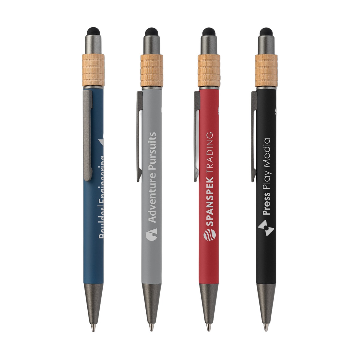 PATENTED. International Registration No. DM/24673. US Patent Pending - 27305-0050-DES1. Introducing the Reborn Spinner Recycled Aluminum Pen w/ Stylus - a stylish choice for your daily writing needs. With its sleek design, the pen features a recycled aluminum barrel with a rubber finish crafted from robust RABS material. The plunger is made from a Bamboo component sourced via responsible forestry, spinning smoothly on ball bearings. It includes a black touchscreen stylus and gunmetal stainless steel clip. Completing its functionality, the pen operates a 1.0 mm ballpoint with a high-capacity Parker-style ink cartridge for a 1,800-meter write-out. The barrel is adorned with a laser-engraved symbol denoting its recycled materials, positioned opposite the clip. 5.79" W x 0.47" D