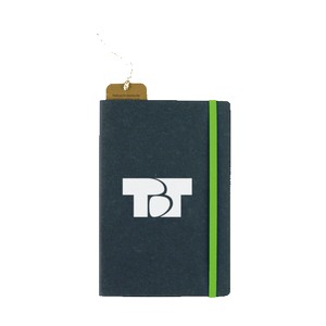 Perfect bound 80-sheet lined notebook with a recycled bonded leather cover and a color elastic band. Recycled paper. 8.25" H x 5.5" W