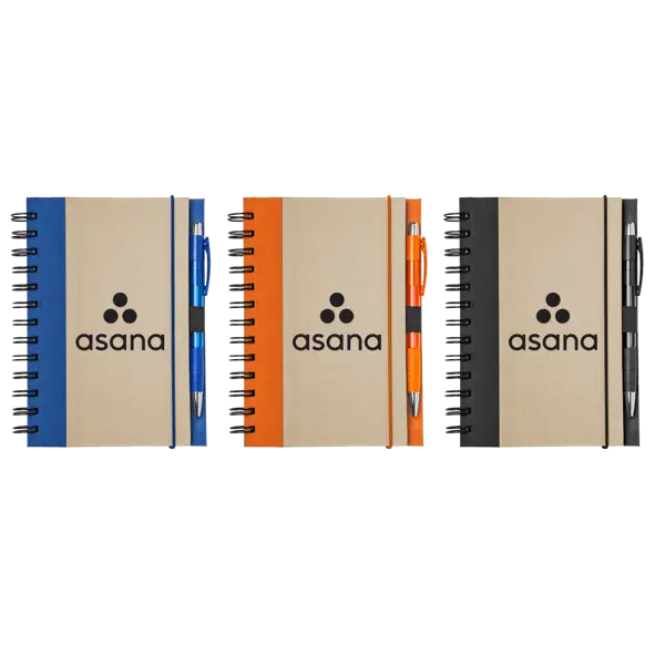 Write your way into an eco-friendly campaign with this Recycled Color Spin Spiral Notebook! Spiral bound with color material accent, it features matching color translucent ballpoint pen, elastic band closure, and recycled front and back cover panels with 80 100% recycled lined pages. Have your logo silkscreened for your next event. At 7" H x 5 1/2" W x 1", it's an ideal piece for recycling centers, campgrounds and community organizations.