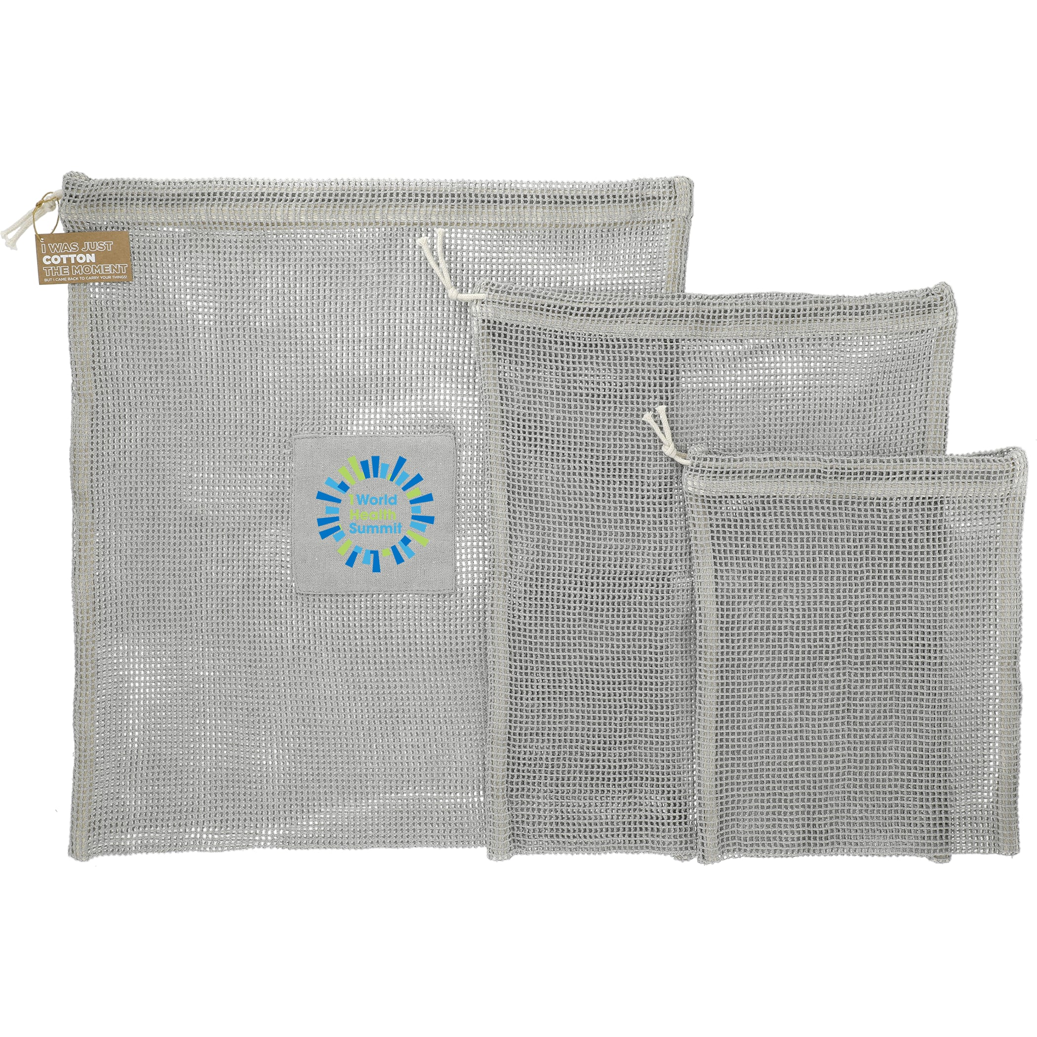 The Recycled Cotton Mesh Cinch Pouch Set was designed to help you stay organized while also being eco-friendly! Perfect for small toiletries, packaged snacks, electronic cables, dirty laundry and more. The large pouch comes with the two smaller pouches inside. The large pouch measures 17'' H X 15'' W, the medium measures 14'' H X 12'' W, and the small measures 8'' H X 10'' W. Through a partnership with 1% For The Planet, one percent of sales of all EcoSmart® products are donated to environmental nonprofits. 0.25" D x 15.00" W x 17.00" H