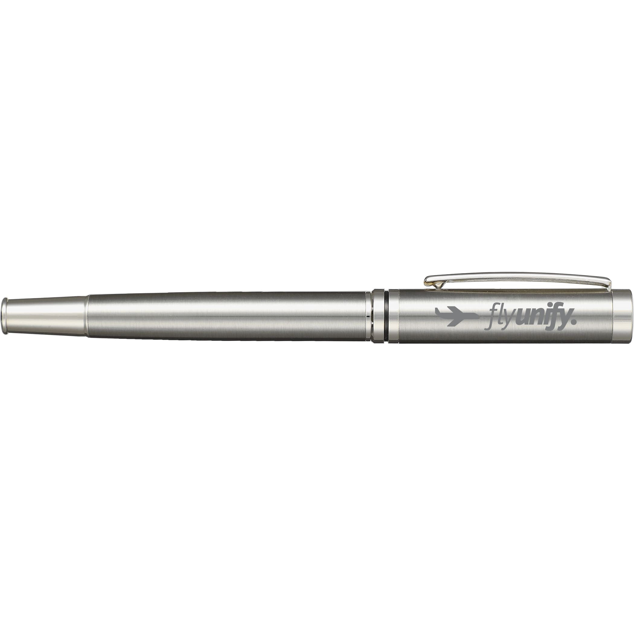The Recycled Stainless Steel Rollerball Pen features a recycled stainless steel barrel with shiny chrome accents and 0.7mm tip. Smooth black ink with 400m of writing length and cap off design. Through a partnership with 1% For The Planet, one percent of sales of all EcoSmart® products are donated to environmental nonprofits. 0.00" D x 0.00" W x 5.35" H