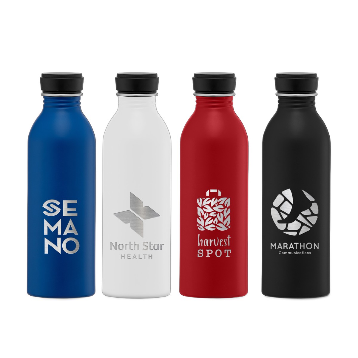 Drinks taste better from brands you love. Our Rio Grande 18 oz Single Wall Aluminum water bottle features a Screw-On, Black Plastic Leakproof Lid. The matte finish in classic corporate colors helps create a highly-visible promo for companies looking to spread their message. This item is ideal for team sports, employee anniversaries, and giveaways. . Complies with Prop 65. 7.68" H x 2.60" W