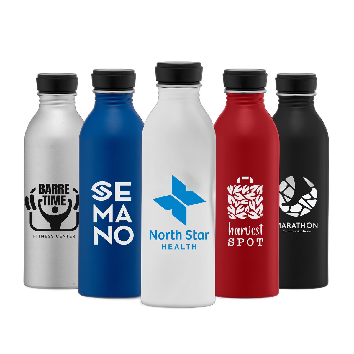 Drinks taste better from brands you love. Our Rio Grande 18 oz Single Wall Aluminum water bottle features a Screw-On, Black Plastic Leakproof Lid. The matte finish in classic corporate colors helps create a highly-visible promo for companies looking to spread their message. This item is ideal for team sports, employee anniversaries, and giveaways. . Complies with Prop 65. 7.68" H x 2.60" W