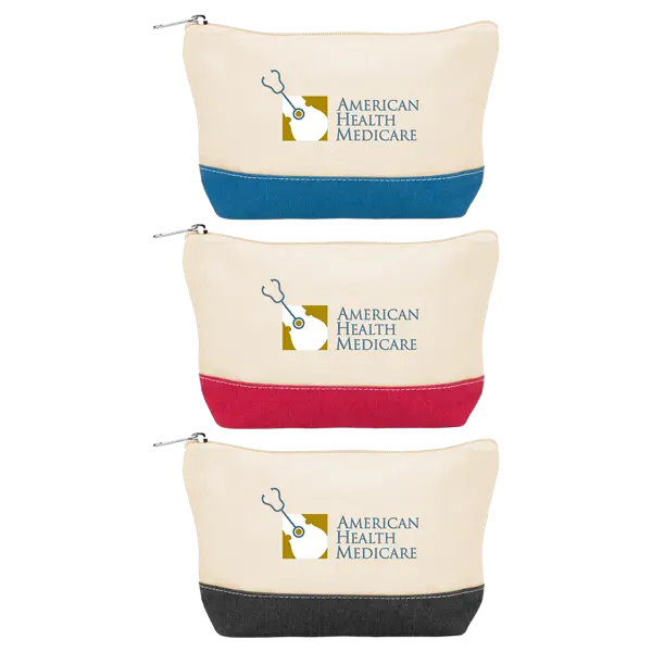 100% 10 Oz. cotton canvas with contrast stitching organizational pouch. Zippered top with flat color blocked bottom. Perfect for holding cables, pens, cosmetics, credit cards, and just about anything that needs organizing. Pair with matching tote bag. 2" D x 5" H x 8.5" W