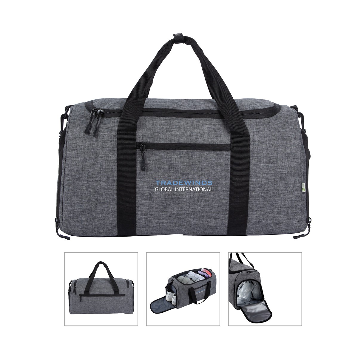 The Rochester RPET Travel Duffel is the perfect size for a weekend getaway or as a carry-on to hold an extra change clothes for domestic or international travel. The Rochester features a front and back zipper compartment, a zippered side shoe pocket, a zippered side PVC-lined pocket for damp items, bottom stiffener, an adjustable and removable shoulder strap and an interior zippered pocket. This duffel can also be used for sports outings, the gym, day trips, car rides, yoga and more. Complies with Prop 65. 19" W x 11" H x 9" D