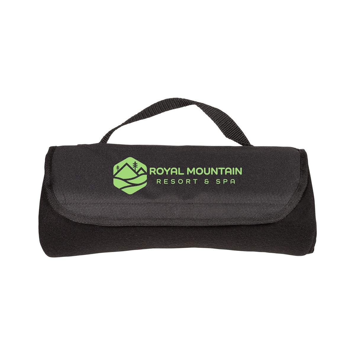 Roll-up blanket with convenient carry handle. Made of Plush 100% Polyester fleece - 180 GSM (8 oz.) with 600D Polyester trim and hook and loop fastener closure. Front flap with pocket (visible in rolled position). Whipstitch trim. Matching webbed handle. Unfolded: 47"w x 53"h. Hand-wash only. 12.1250" W x 5.2500" Diameter
