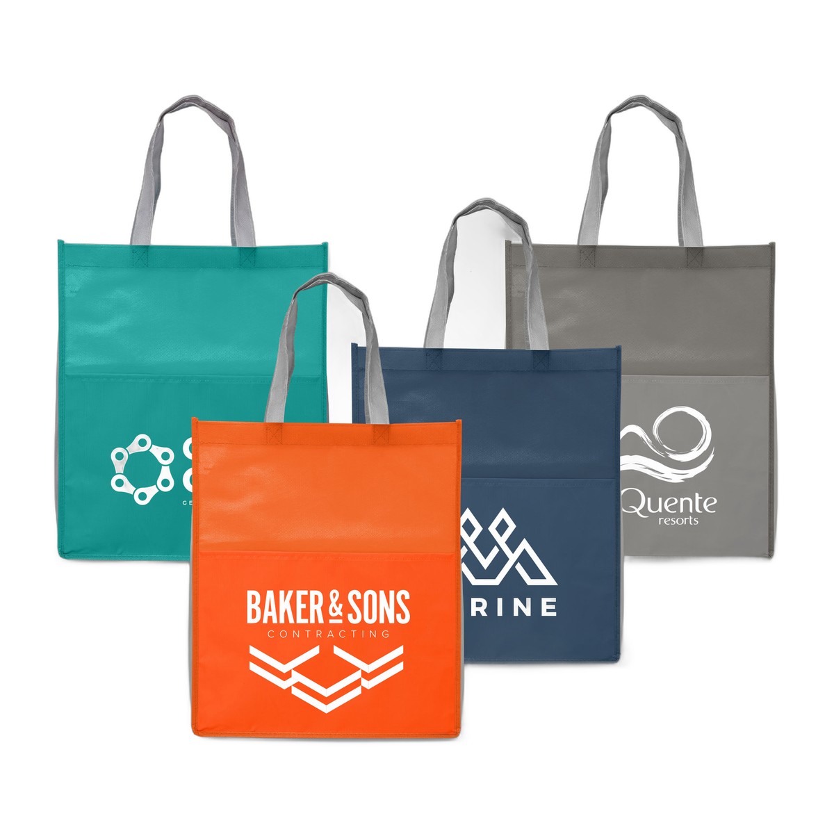 The Rome RPET tote uses Recycled PET Plastic (RPET) made with recycled plastic water bottles. This is a great way for businesses to share their brand in a sustainable way. It features eye-catching color options with gray side panels and handles. The large front pocket is great for holding phones, keys, and more, making this a convenient shopper tote. . Complies with Prop 65. 16.34" H x 13.78" W x 7.68" D