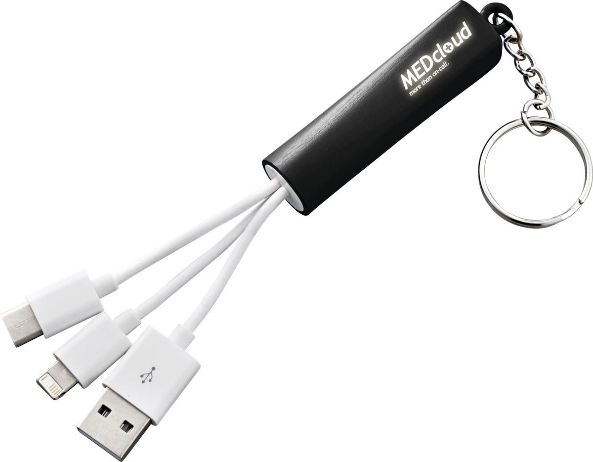 The Bullet Route Light Up 3-in-1 Charging Cable is a multi-use cable. It features a USB A tip, USB Type C tip, and a 2-in-1 dual compatible tip for both iOS and Android devices with 2A current. This 3-in-1 cable also comes with a key chain for convenient carrying. This item must be lasered to reveal the light up function. Not compatible with iPad Pro. It is recommended to use an AC adapter, power bank or car charger to charge devices instead of using outputs from laptop or computer as power source. 2.25" D x 0.50" W x 0.50" H