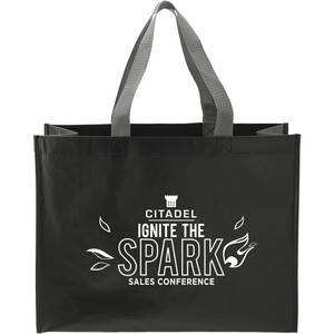 The RPET Laminated Matte Non-Woven Shopper Tote features a retail-inspired design with a soft RPET spun bond non-woven main material. It also includes double nylon webbing handles and an eye-catching recycling graphic on the side panels. Through a partnership with 1% For The Planet one percent of sales of this and all EcoSmart products will be donated to nonprofits dedicated to protecting the planet. This tote was previously Leed's 2160-51, RPET Laminated Matte Non-Woven Shopper Tote. 7.00" D x 17.00" W x 13.00" H