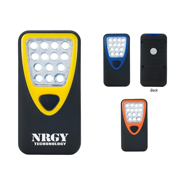 Shine a light on your logo with the rubberized working light with a heavy duty magnet! Featuring 14 extra bright white LED lights, a magnet on the back and a slide up hook for hanging, this light is a heavy duty essential. 3 AAA batteries included. With a comfortable rubberized grip, this light is a great giveaway for tradeshows, conventions, construction companies, and even national parks. Customize this practical promotion with an imprint of your logo or company name on the front and choose this for your next event!