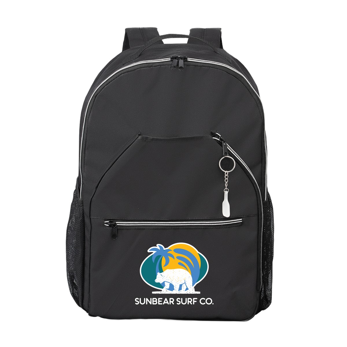 Introducing the Rumo Backpack, the ideal carry solution for the growing community of pickleball and paddle sport enthusiasts. The durable, 23-liter backpack features main panels and lining crafted from 600D, 100% post-consumer recycled polyester with a protective PU backing. It includes a Digital Product Passport and a sewn-in QR code tag, highlighting the use of responsibly-sourced materials. The bag is designed with sport-specific functionality, including a dedicated zippered front pocket perfectly sized to securely hold your paddle or racket. Organization is effortless with a spacious main compartment, two additional zippered front pockets for small gear, and two mesh side pockets ideal for water bottles or balls. Complete with a padded back and adjustable shoulder straps for comfort, and a mini paddle zipper charm for a playful touch, the Rumo is a versatile and robust bag for every sports outing. 16.93" H x 11.81" W x 5.12" D