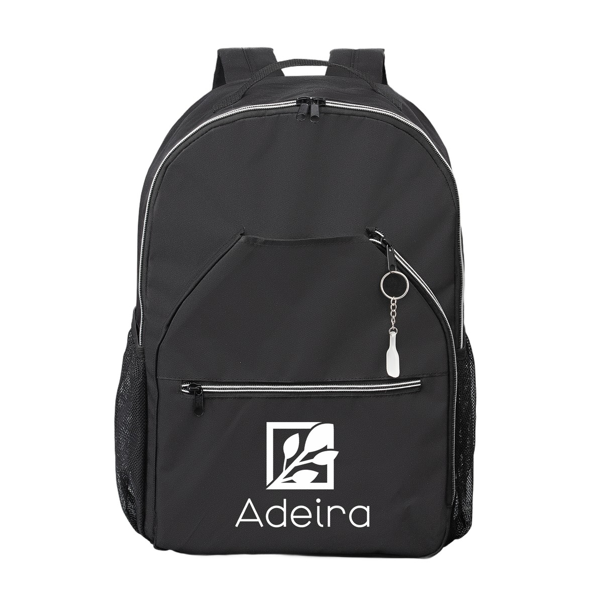 Introducing the Rumo Backpack, the ideal carry solution for the growing community of pickleball and paddle sport enthusiasts. The durable, 23-liter backpack features main panels and lining crafted from 600D, 100% post-consumer recycled polyester with a protective PU backing. It includes a Digital Product Passport and a sewn-in QR code tag, highlighting the use of responsibly-sourced materials. The bag is designed with sport-specific functionality, including a dedicated zippered front pocket perfectly sized to securely hold your paddle or racket. Organization is effortless with a spacious main compartment, two additional zippered front pockets for small gear, and two mesh side pockets ideal for water bottles or balls. Complete with a padded back and adjustable shoulder straps for comfort, and a mini paddle zipper charm for a playful touch, the Rumo is a versatile and robust bag for every sports outing. 16.93" H x 11.81" W x 5.12" D