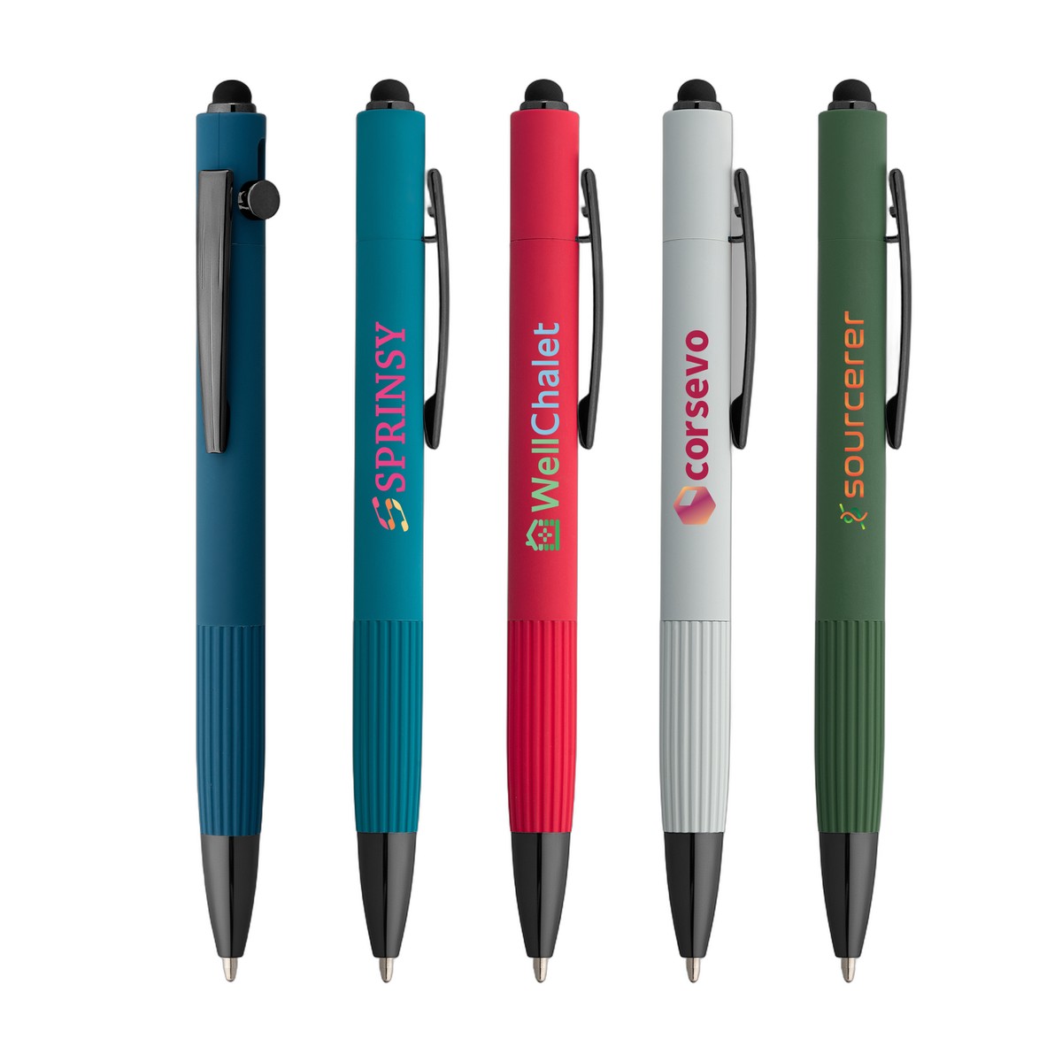 Elevate every interaction with the Saga Recycled Aluminum Bolt Action Stylus Pen—where sustainable innovation meets sophisticated style. Crafted from recycled aluminum with durable rABS gunmetal trim and a steel clip, it features a soft-touch rubberized barrel and micro-line grip texture for added control. The bold bolt-action mechanism provides smooth, satisfying retraction, while the black rubber stylus ensures seamless touchscreen use. A slim Dokumental® refill with a 1.0 mm tip delivers crisp black ink and a 500-meter write-out. With sleek chrome UV accents and premium materials throughout, the Saga Pen is a refined choice for professionals who value both design and function. 5.91" W x 0.39" D