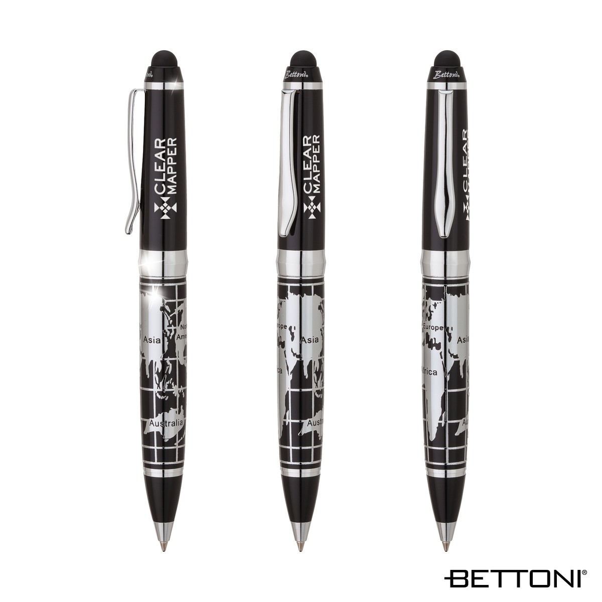Elegant heavyweight brass ballpoint with twist-action mechanism, a capacitive stylus, a chrome world map barrel, high gloss lacquer finish and chrome trim. Complies with Prop 65. 11/16" W x 5 11/16" H x 9/16" D
