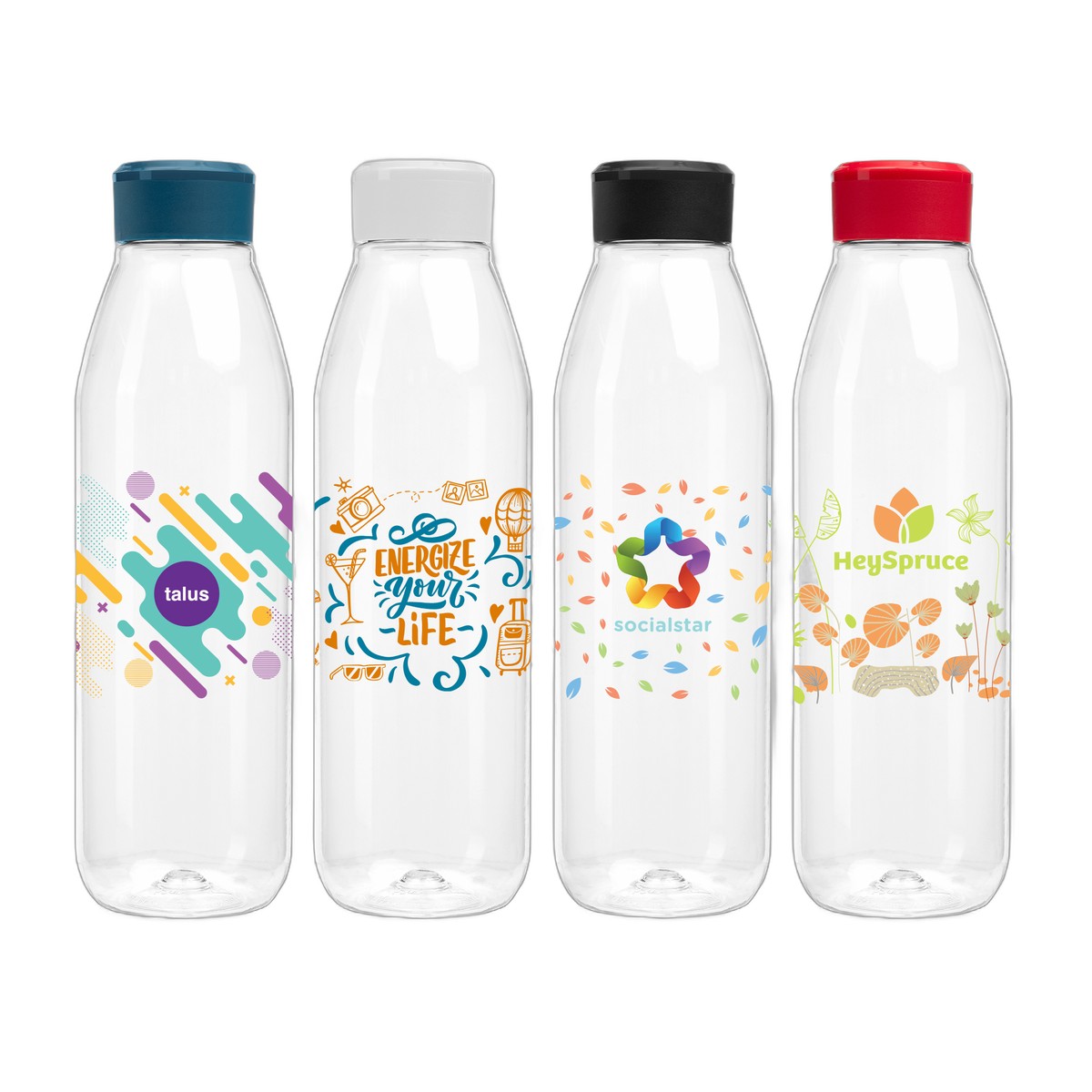 Salo Tritan Renew Color Cap Bottle - 25 oz. is a clear, single-wall bottle made from Tritan Renew, composed of 50% recycled Tritan and 50% virgin Tritan. It features a leakproof design and a colored screw-on lid made of PP. With a 25oz capacity, this bottle is designed exclusively for cold drinks. It is not suitable for dishwashers or microwaves, making it a durable, everyday option for staying hydrated on the go. Complies with Prop 65. 9.84" H x 2.56" W