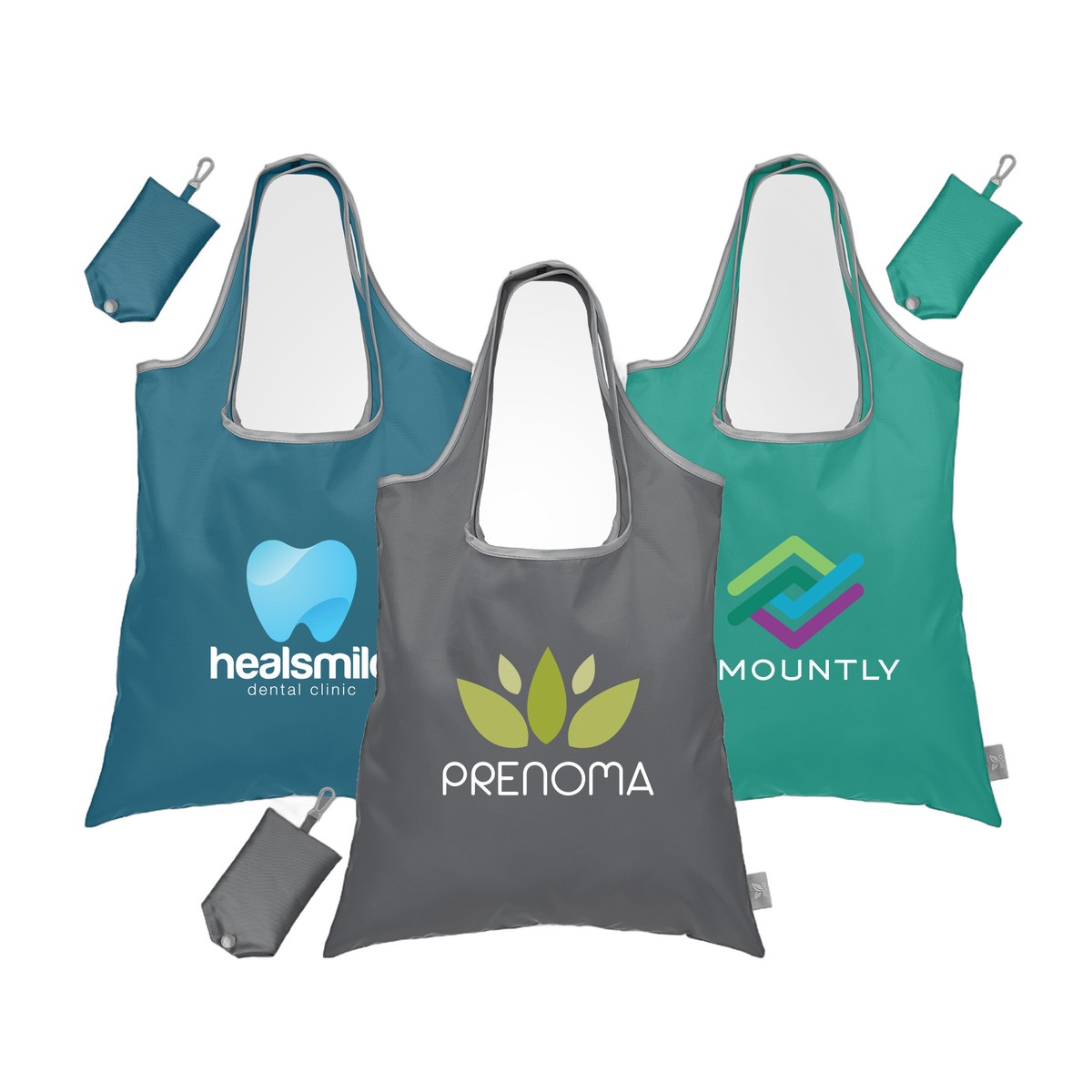 Our best-selling Santorini is now available in RPET - recycled polyester fabric. This reusable tote bag features integrated double handles, and it easily folds up into and stores inside a self-containing pouch. A small carrying clasp makes this shopping tote easy to secure, store and find within a larger handbag, backpack, or even a keyring. An Eco sticker sewn on each bag, along with nature-inspired colors, help emphasize this tote bag's mission. . Complies with Prop 65. 24.25" H x 15.28" W