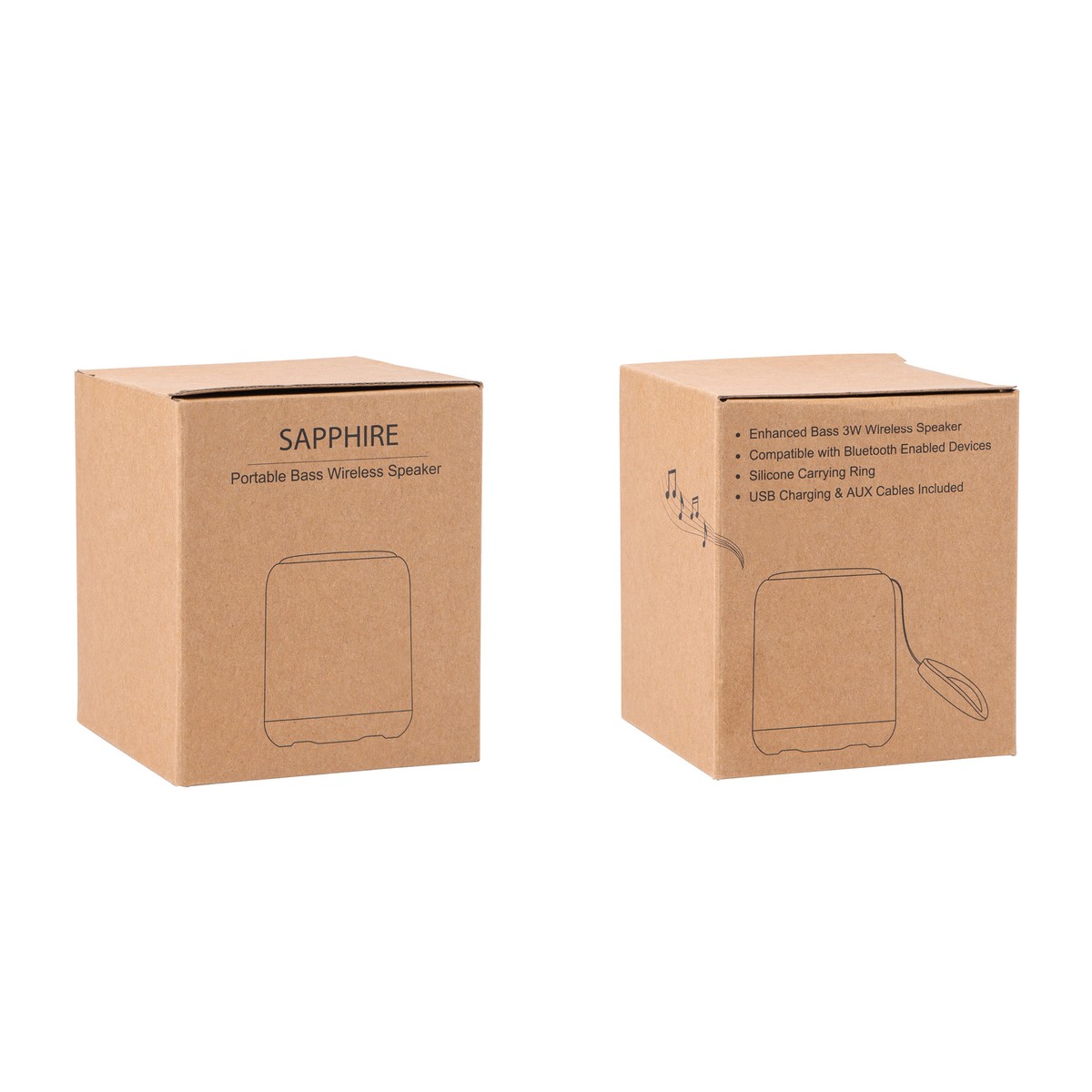 The Sapphire Wireless Speaker is sure to get everyones attention with its crystal clear sound and deep bass. And its sleek cylindrical body shape with smooth satin coating looks great in any environment. With a 3 Watt output this 4Ohm, 40mm speaker can be played for 6 hours at max volume within a 30' (10 meters) operating range at home, in the office or outdoors. Gift this speaker to your music lover friends or employees! The Sapphire includes an 1/8" AUX cable, TF card slot, carry ring, and a micro-USB charging cable to recharge its 1200mAh lithium battery and comes in a brown gift box. Playback time: 6 hours per charge; Charge time: 3 hours; Output: 3W. Complies with Prop 65. 3" W x 3 1/2" H x 3" D