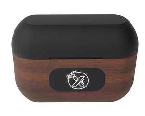These waterproof wireless earbuds provide high-quality stereo sound for hours. Keep the earbuds charged with the accompanying walnut wood charging case that features an illuminated logo. Includes a charging cable, premium gift box, and 3-year warranty. Patent pending. 2.4375" W x 1.6875" H x 1.125" D