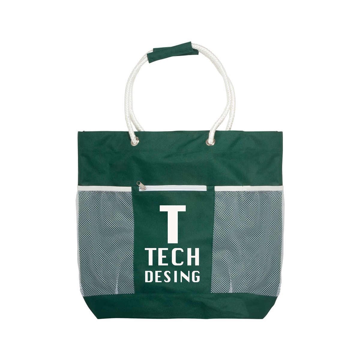 600D Polyester tote. Zippered front pocket, mesh side pockets (approx. 5.9"w x 10"h each) and inside zippered safety pouch. 26"l rope handles with padded grips. Recommended weight tolerance: 11 lbs. *24-hour rush service only applies to catalog quantities up to 600 units. 21.0000" W x 17.7500" H x 5.5000" D