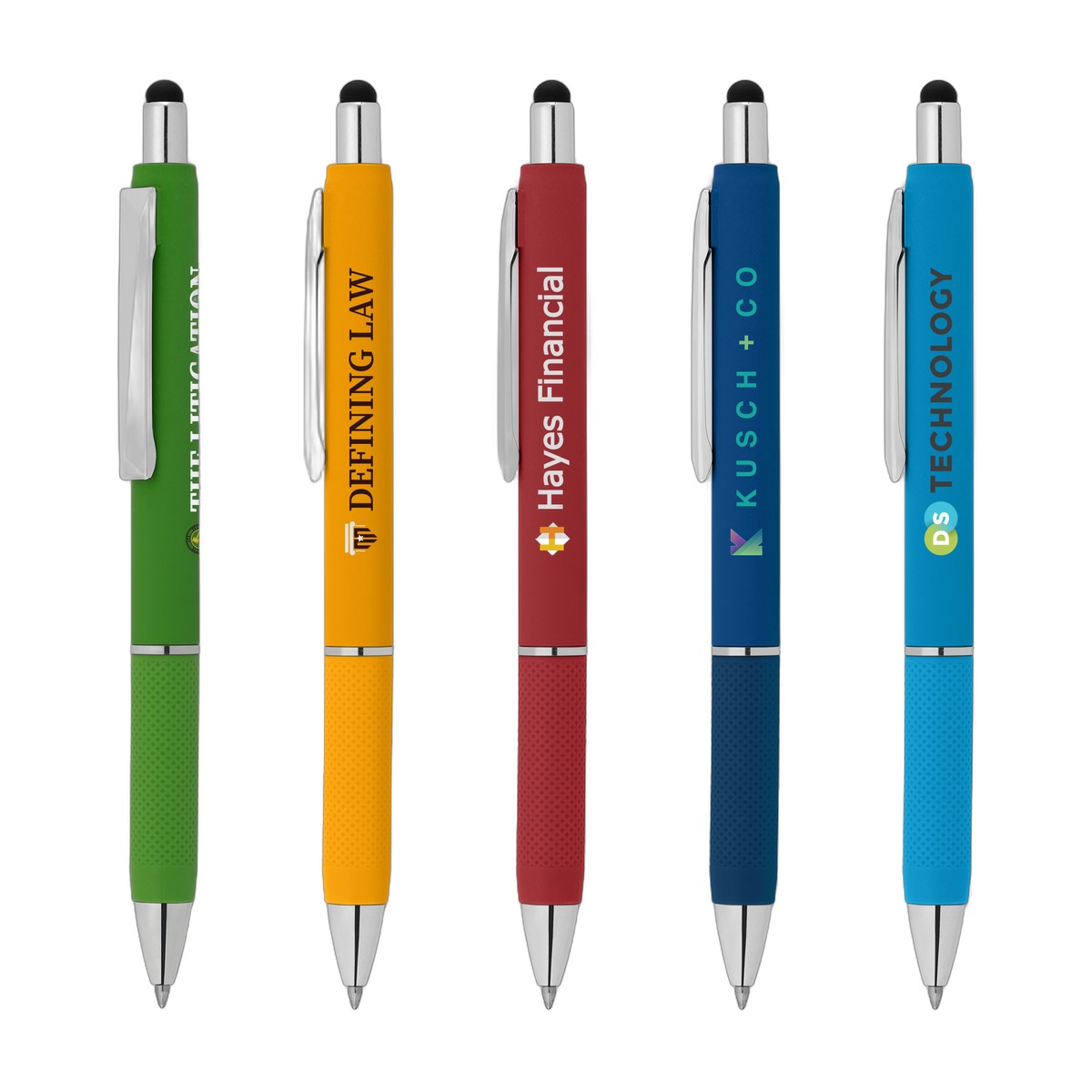 Experience the effortless joy of writing with our Serena Retractable Gel Stylus Pen. This retractable plastic pen combines vibrant colors with a comfortable grip, offering a smooth and enjoyable writing experience with its sleek gel ink. The bright ABS plastic barrel features a colorful rubber finish, while the chrome-trimmed tip, ring, clip, and plunger add a touch of sophistication. The pen is not only a pleasure to write with but also includes a black stylus for seamless transitions between paper and digital devices. Complies with Prop 65. 5.71" W x 0.43" D