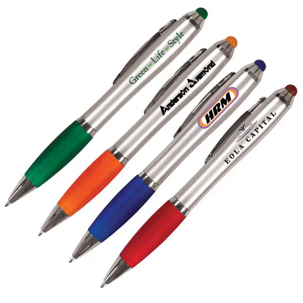The Silhouette Stylus Pen, has full color digital printing in an assortment of colors. Stylish twist action pen. Contoured barrel with distinctive grip design. Silicone stylus tips match grips. Chrome accents.