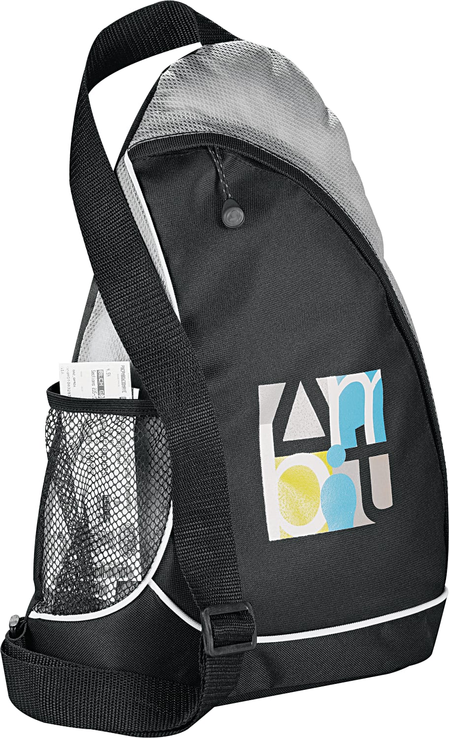 The Sling Shot Sling Backpack features a main zippered compartment, a side mesh water bottle pocket and an adjustable cross-over shoulder strap. 3.50" D x 13.00" W x 17.00" H