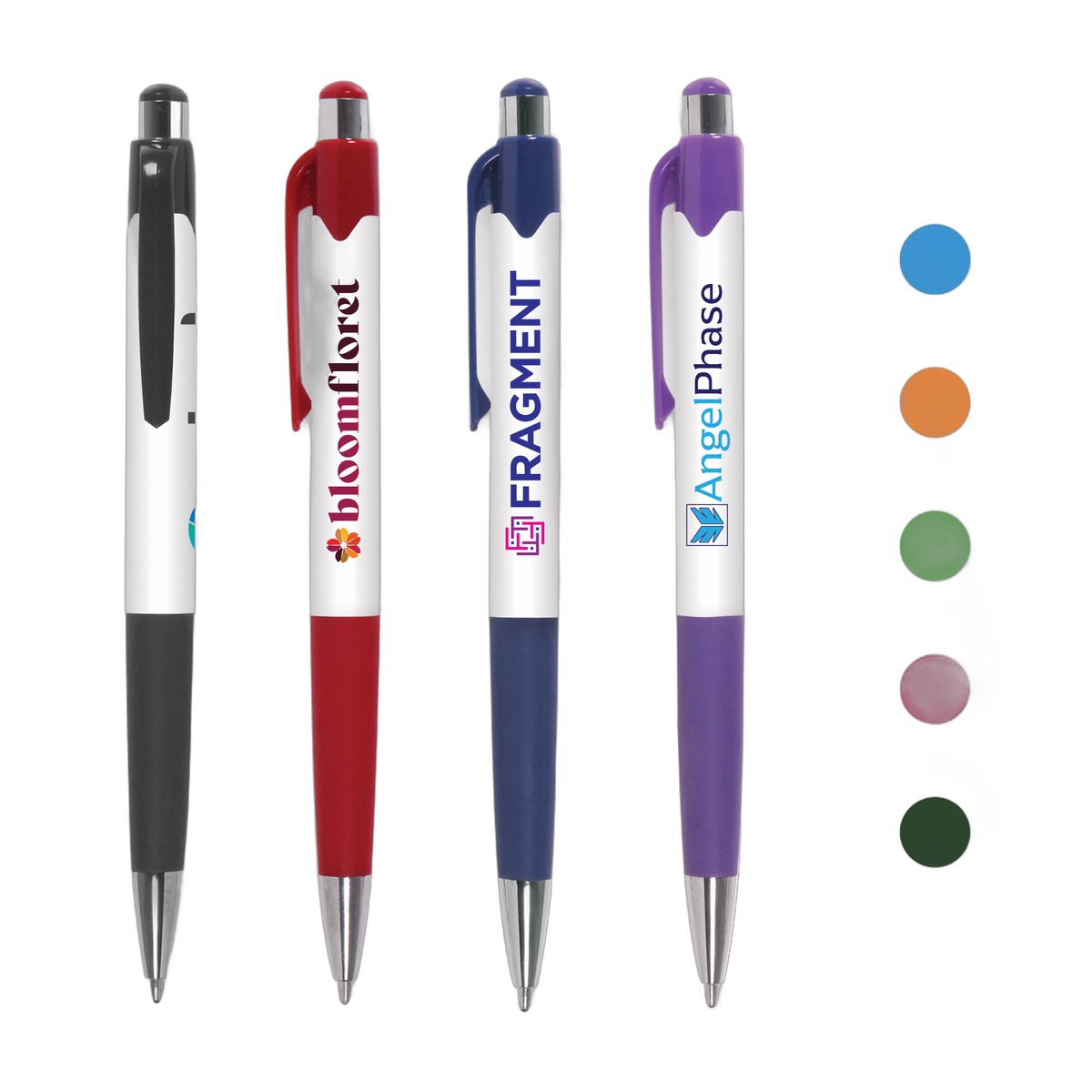 The Smoothy Classic plastic ballpoint pen comes with a selection of different matching trims, grips, and accents to choose from. A white barrel is the perfect background to make full color direct imprints (ColorJet technology) pop. An excellent value for an eye-catching, color-coordinated pen! Complies with Prop 65. 5.41" W x 0.41" D
