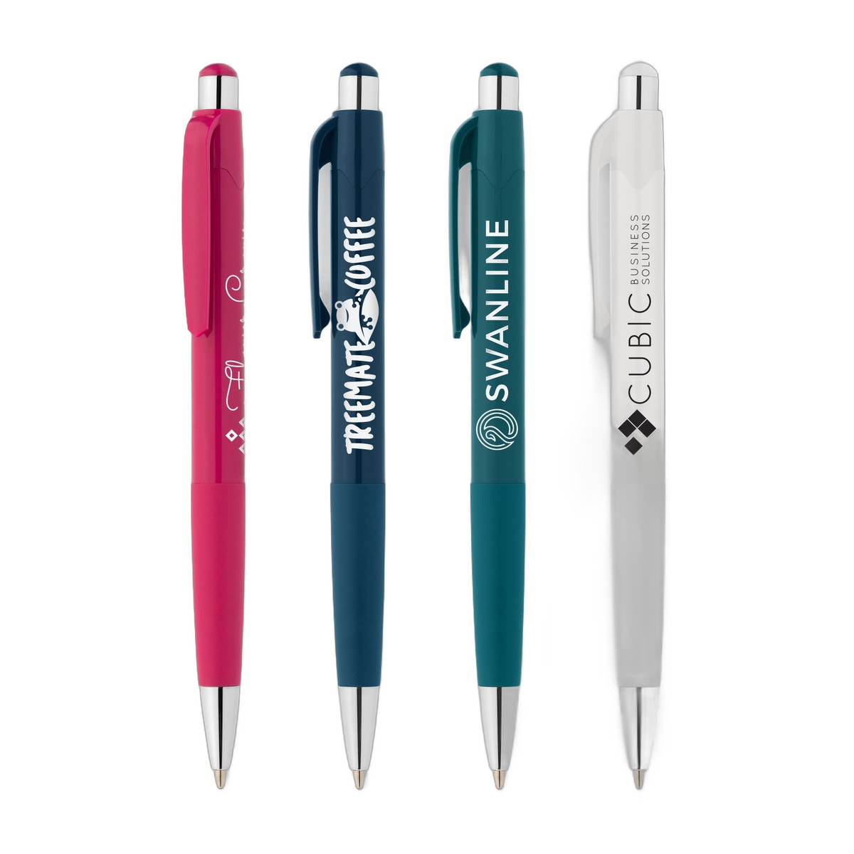 Enhance your promotional strategy effortlessly with the stylish Smoothy Deluxe Pen! This sleek ballpoint pen features a solid ABS and TPE injected plastic barrel with chrome-plated trim, ensuring both resilience and a professional appearance. It boasts a retractable design with a chrome plunger and tip, complemented by a soft grip area for superior writing comfort. Customize the color-matching accent piece with your company logo or message to make a lasting impression. With a 1.0mm tip size and Dokumental ink that writes out up to 500 meters, this pen combines functionality with flair. Available in assorted colors, it's the perfect choice to showcase your brand at any promotional event. Complies with Prop 65. 5.39" W x 0.41" D