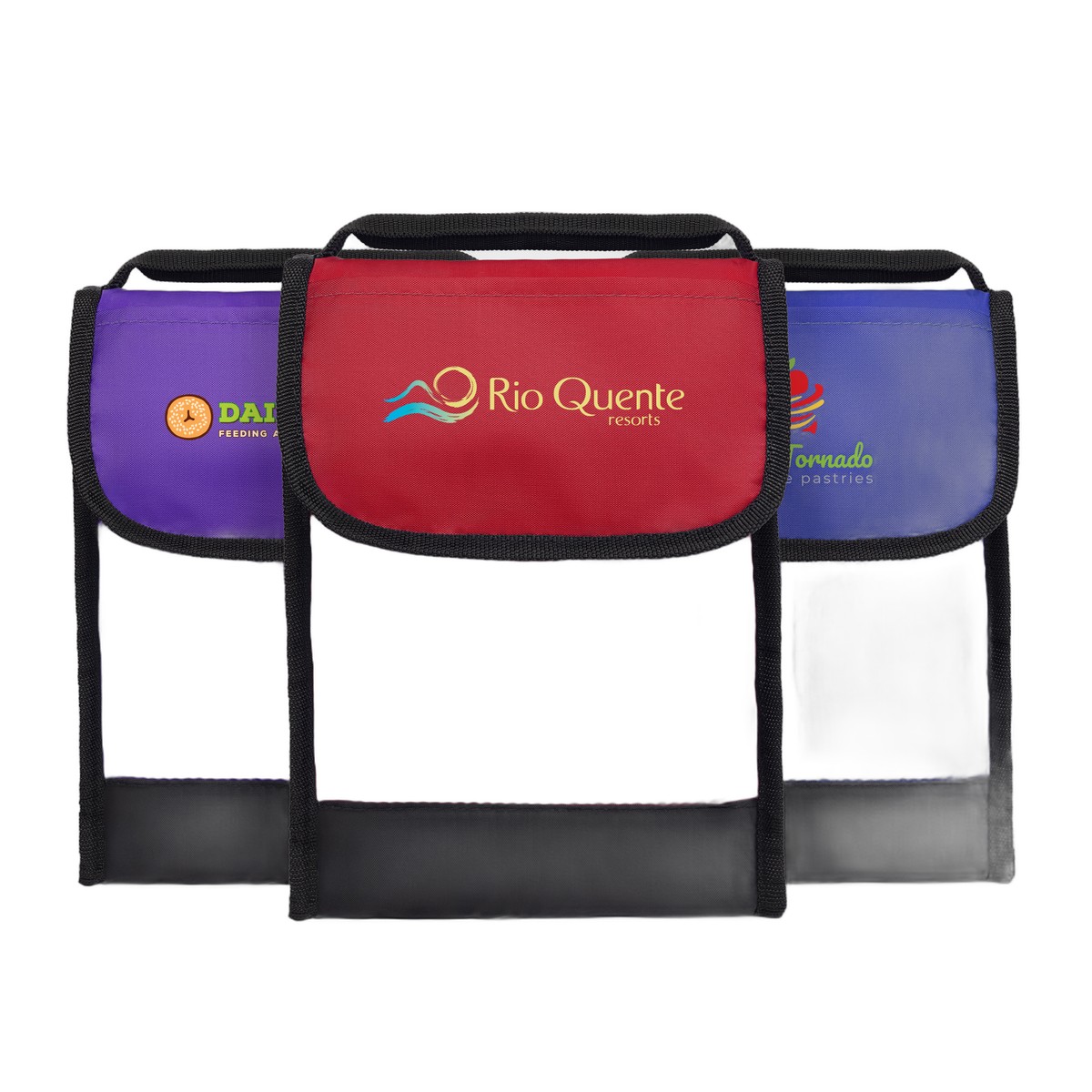 This insulated lunch bag has a PEVA lining to help keep contents fresh, along with a front pocket and clear ID holder on the back for easy identification in the lunchroom. Black carrying handle and accents create an added color contrast. Customize the front flap with a full-color imprint (ColorJet technology). Complies with Prop 65. 10.55" H x 7.40" W x 4.33" D