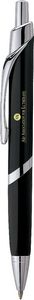 The SoBe Ballpoint Pen has a retractable ballpoint that features a triangular-shaped barrel with chrome trim. It comes in several different colors. This pen features a 1.0mm tip and black/blue ink. Laser finish is shiny brass. 5.37" Diameter x 5.37" D