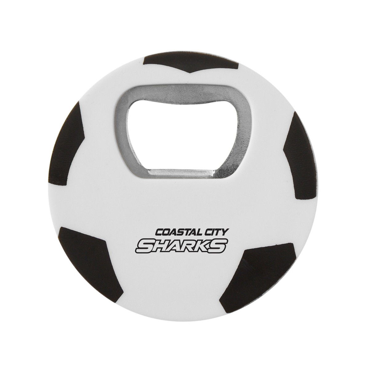 Soccer ball sports ball-shaped bottle opener. Features soccer ball stock art on both sides. Made of durable ABS Plastic with stainless opener insert. Features heavy duty magnet on back to store on refrigerator and other metal items. Designed for opening bottles and flip-top cans. 0.17" D x 2.75" Diameter