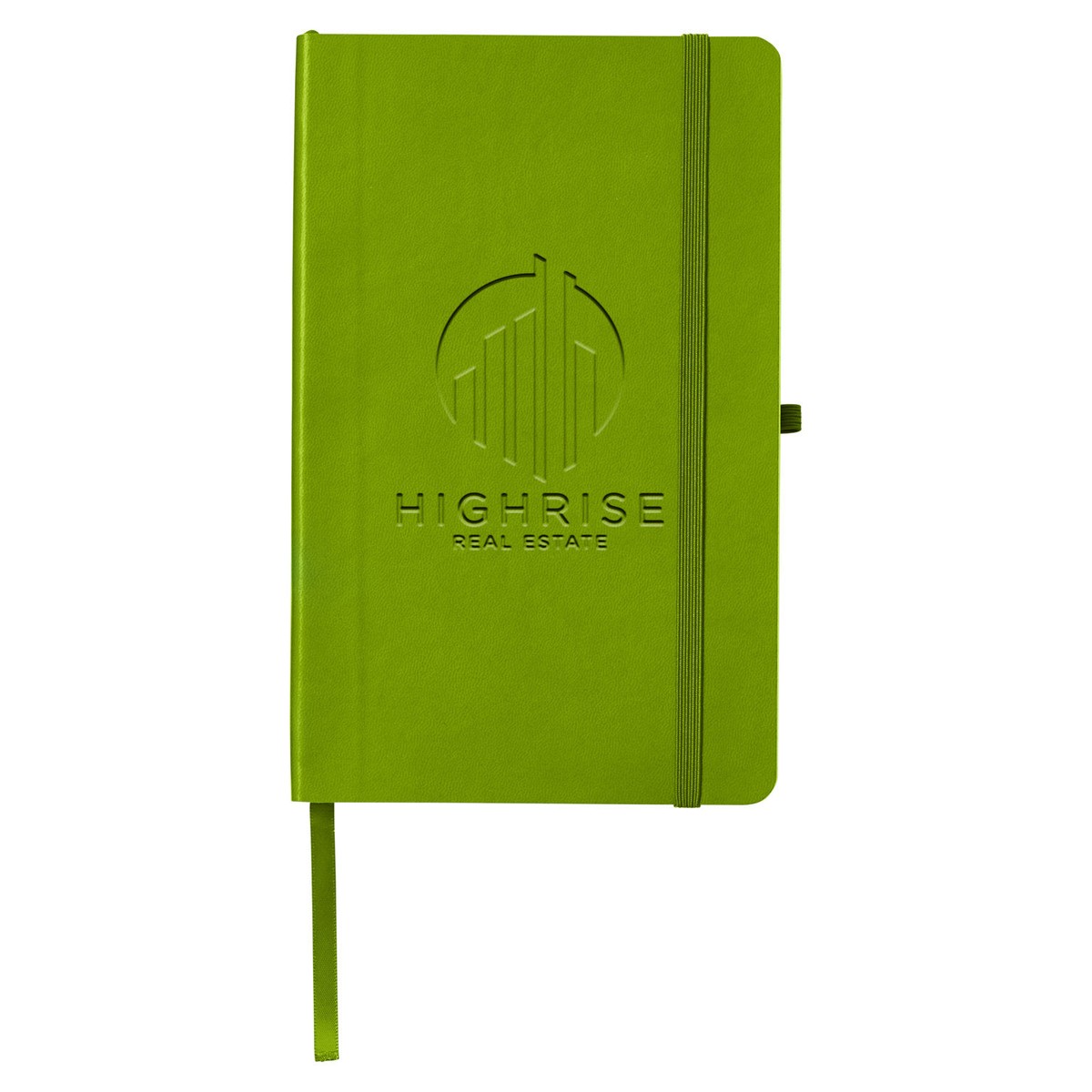 96 cream lined sheets of sustainably sourced paper (wide rule). Elastic closure, pen loop and ribbon bookmark (color to match cover color). Expandable pocket on inside back cover. Core 365® branding debossed on back cover. 5.2500" W x 8.2500" H x 0.5000" D
