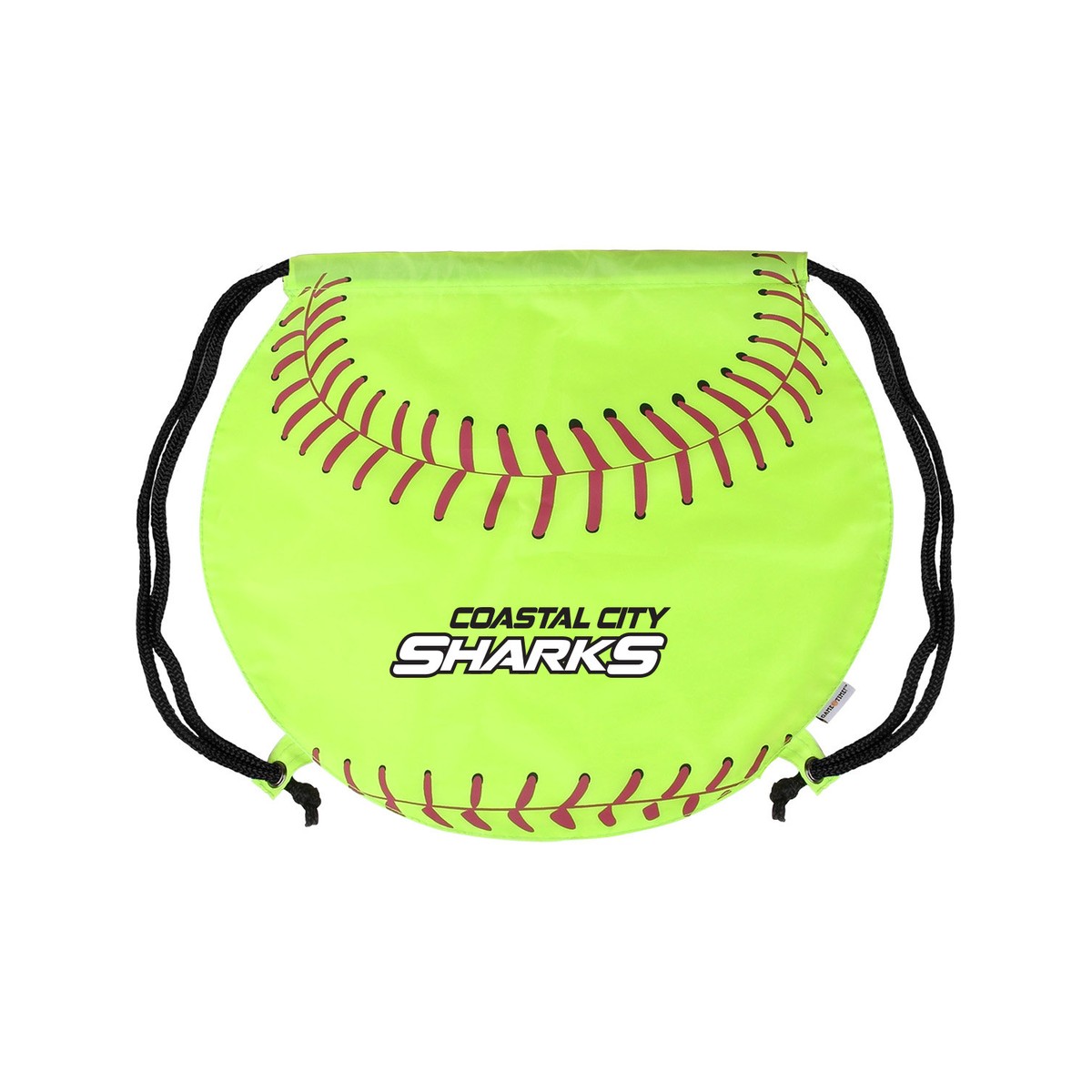 **A PrimeLine Exclusive! ** Made of 210D Polyester and features grommeted adjustable soft black Nylon shoulder strap doubles as drawstring closure. Unique alternative to the basic cinch up backpack. Softball stitching stock art comes pre-printed on the front of each bag. Add your logo or message for an exciting and professional giveaway or promotion. Recommended weight tolerance: 6.5 lbs. United States Design Patent No.: US D615,756 S. 17" W x 14.5" H