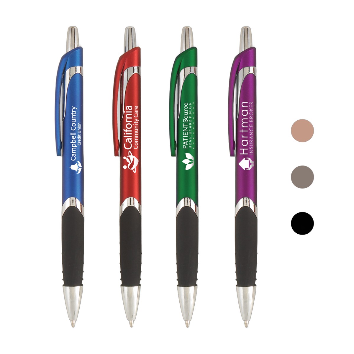 The Solana Grip pen features a black rubber grip and a quick-click plunger, for a smooth and comfortable writing experience. An affordable plastic pen with metallic curb appeal, the silver accents and imprints make this pen stand out from the rest. Great for clipping to brochures and collateral at tradeshows and events. Complies with Prop 65. 5.71" W x 0.43" D