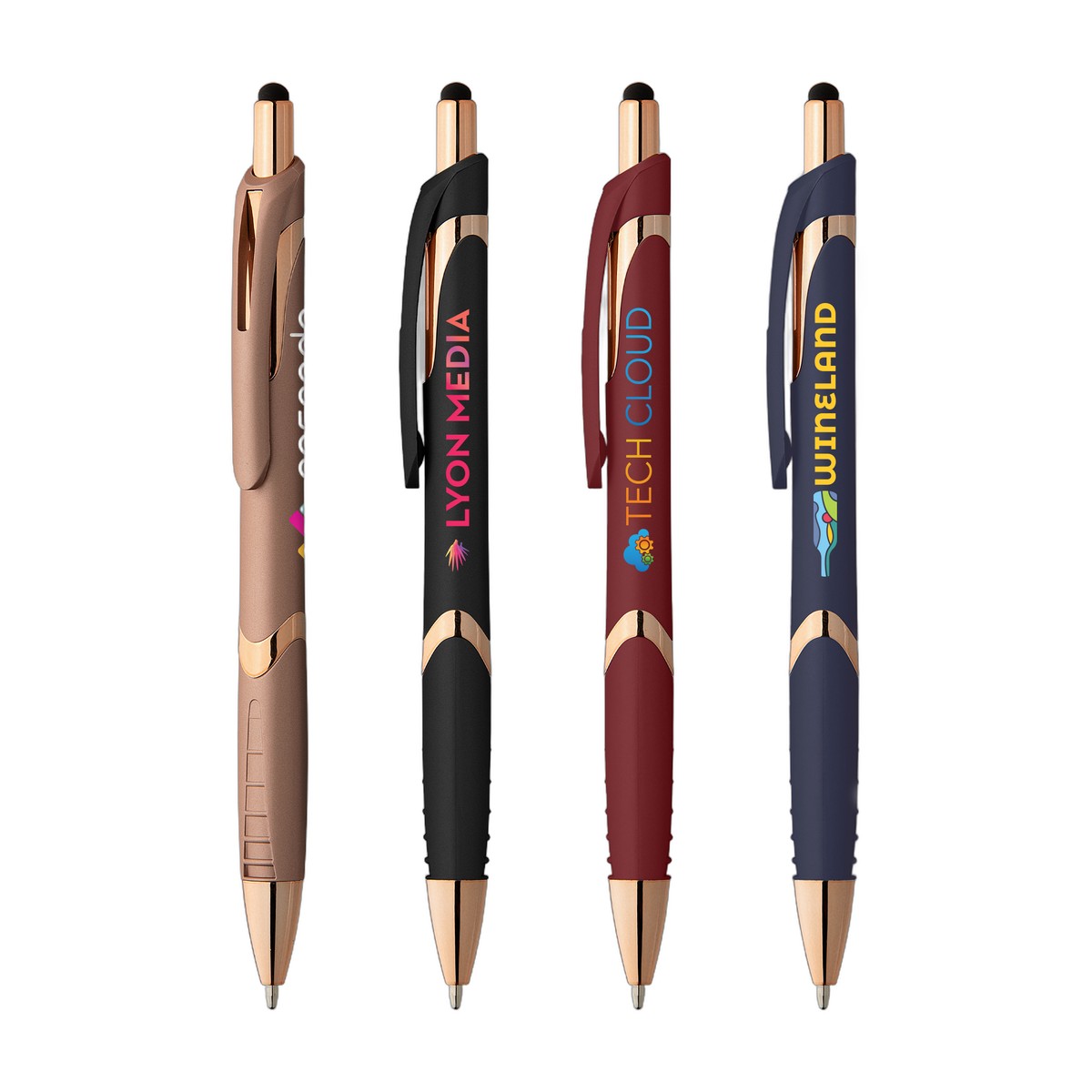 The Solana Softy Rose Gold with Stylus features super-stylish rose gold accents that really shine next to luxurious soft-touch barrel colors. This click-action plastic retractable ballpoint pen features a soft, rubberized barrel with a matching grip, plus capacitive stylus for use with all your digital touchscreen devices. . This stylish pen is an ideal way to promote your brand and delight your fans! Complies with Prop 65. 5.76" W x 0.45" D