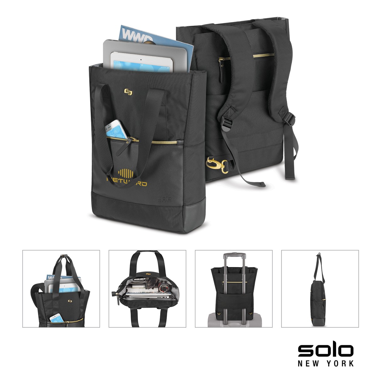 The Parker Hybrid Backpack Tote from Solo New York's Triumph Collection is both gorgeous and functional converting easily from a tote to a backpack. This classic black bag with gold accents has a fully padded laptop compartment that fits 15.6 laptops and ultrabooks and 15 Macbooks and brings elegant style to the work place, travel or a shopping excursion. It has a back panel that slides over your luggage handle, carry handles that are beautifully attached with a leatherette strap and gold button, padded adjustable backpack straps with gold carabiner clips that hideaway while not in use, and bottom feet for stabilization and protection. You can store small items in the front zippered pocket, the back zippered pocket, and in the zippered pocket and organizer in the main compartment. The Parker Hybrid bag has a 5-year limited warranty. Complies with Prop 65. 15" W x 18 1/8" H x 3" D