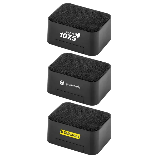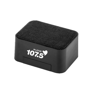 Rechargeable wireless fabric speaker and phone stand. On/off switch panel on back; pull out stand for phones; playtime: approx. 1.5 hours; USB charging cable included. 2.375" D x 1.6875" H x 3.25" W