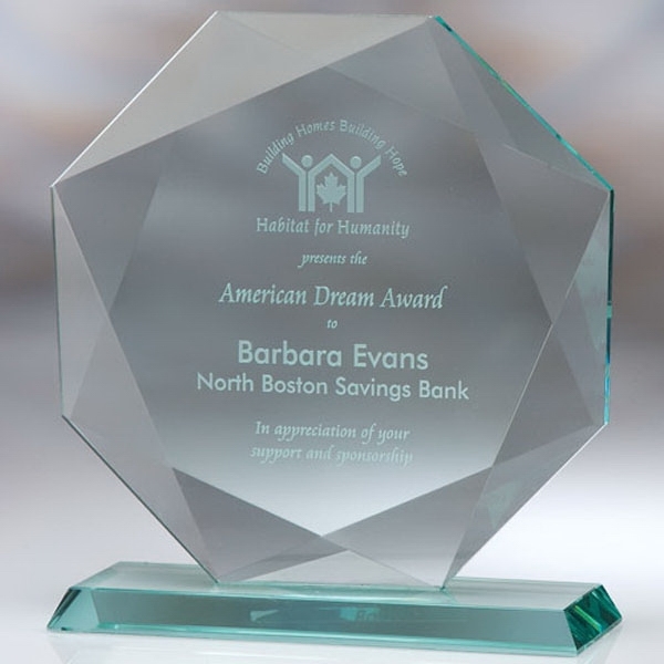 Sosa Award. A clear, beveled edged, octagon shaped plaque on a flat base. Great for employee recognition, retirement gifts, corporate gifts, corporate awards, and desk accessories. 5 3/4" W x 6 1/2" H x 1/2" D.