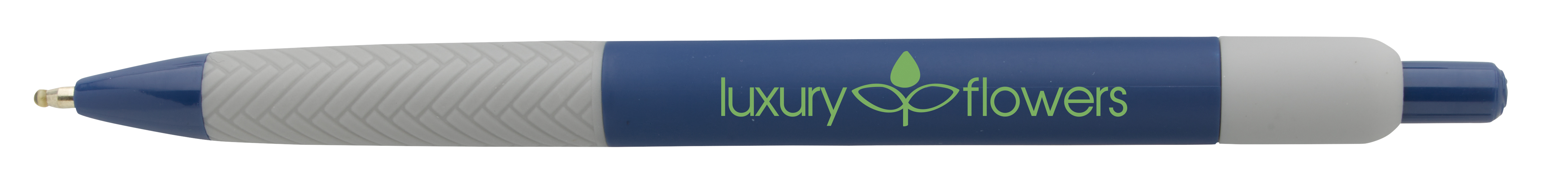 This retractable's moody earth tones and rubberized finish will bring a sense of relaxation to your next writing assignment. A classic herringbone-patterned grip adds to the relaxed design. With a 1mm medium hybrid ink for smooth write-out, this pen perfectly pairs function and style. Contains 56% recycled post-consumer recycled ABS. 0.4375" Diameter x 5.6875" L