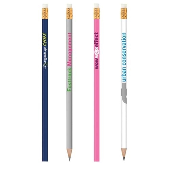Wood barrels and large imprint area. For longer imprint life, imprints will be placed toward eraser end of barrel. All include a gold ferrule and white eraser.Lead: #2 Graphite Leads.