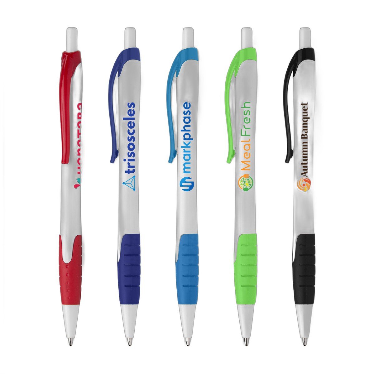 Ignite your marketing message with our super affordable Spark Grip Pen. With its classic design and comfort grip in bold colors with matching clip, the Spark Grip Pen will showcase your 1-color logo on its white barrel. This medium ballpoint plastic pen includes black ink, and its strong value price point will allow you to stretch your marketing budget for maximum impact. Complies with Prop 65. 5.63" W x 0.35" D