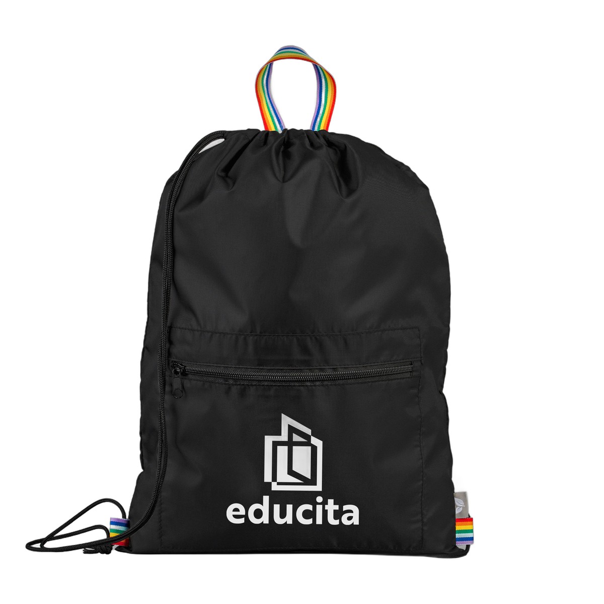 Add a splash of color to your daily essentials with the Spectrum Recycled Polyester Drawstring Bag - 2 gal. Made from durable RPET polyester, this versatile bag features a spacious main compartment with a secure black drawstring closure, perfect for keeping your belongings safe on the go. A convenient zippered front pocket offers quick access to small items, while the vibrant rainbow webbing on the top handle and side loops brings a playful and eye-catching touch. Inside, a QR code links to the Digital Product Passport, adding a modern twist to this everyday essential. Complies with Prop 65. 17.72" H x 13.39" W