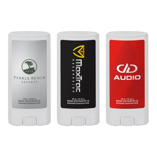Chuck Norris doesn't get sunburns ... the sun knows better! But not all of us are so lucky. That's why this giveaway will be a big hit at any outdoor event. Made in the USA, our SPF 30 sunscreen sun stick is broad-spectrum, PABA-free AND water-resistant. Customize it with a full-color label and a coconut breeze scent so that customers associate your brand with both safety and summery fun! Because your swag should kick as much butt as the king of KA-RA-TE. Available in Unscented sunscreen only. Complies with CPSIA, FDA, Prop 65. 1.25" W x 3.625" H