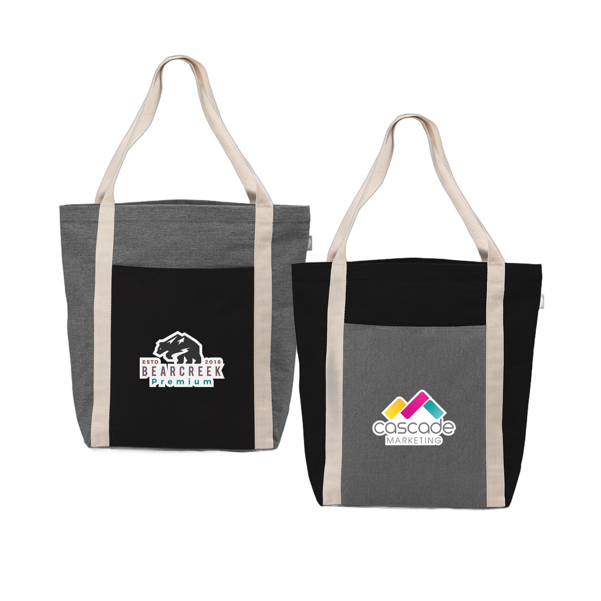 Discover our Spun Recycled Cotton Blend Tote Bag, your versatile and stylish everyday companion, crafted from durable 7 oz. recycled cotton (55% cotton + 45% polyester), this bag blends two different colors with long, solid and natural handles for sophistication, it features a spacious main compartment, along with a 8.8" x 11.8" front pocket, offering practicality and style. With a 15L capacity and a maximum weight of 11 lbs, it's both lightweight and sturdy. Your logo will be imprinted in Silkscreen. Complies with Prop 65. 15.75" H x 17.32" W x 5.12" D