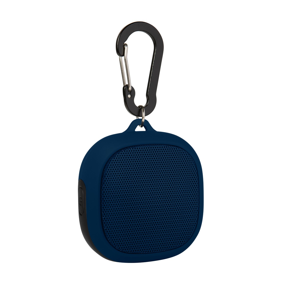 ABS Plastic wireless speaker casing with Iron grill and Aluminum carabiner. Take your music anywhere with this portable speaker, featuring a sleek rubberized finish for a smooth, durable feel. Includes a carabiner clip that can be attached to your backpack or bag. Rechargeable 450mAh lithium polymer battery. 3W speaker output; approx. 30' wireless range, wireless version 5.0. 2.8000" W x 2.8000" H x 0.8000" D